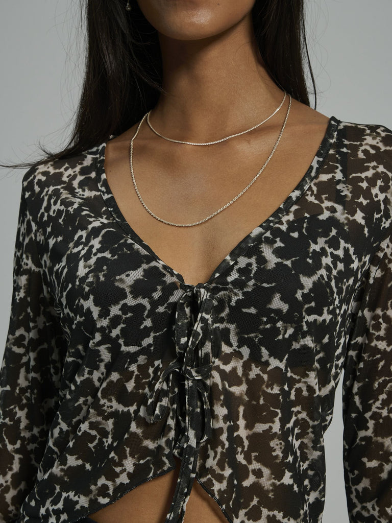 Το PROJECT SOMA Giulia κατασκευάζεται από τούλινο ελαστικό ύφασμα. Εμπριμέ τοπ με δέσιμο μπροστά που μπορεί να φορεθεί σαν ζακετάκι.