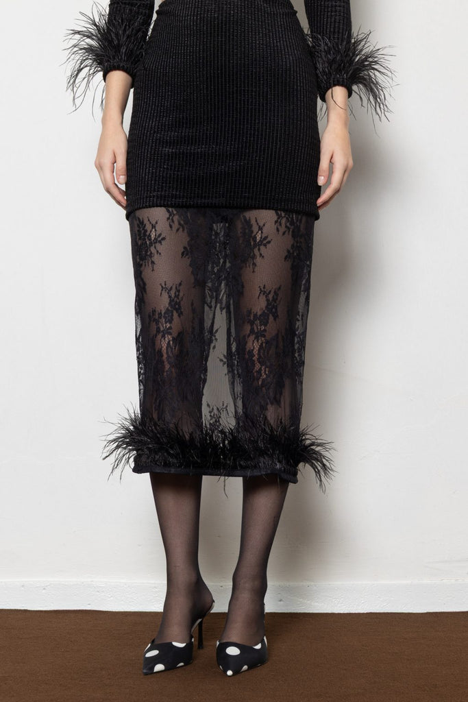 Sheer seduction. This black velvet and lace skirt features a figure-hugging silhouette and feather-trimmed hem — a bold blend of texture and allure.