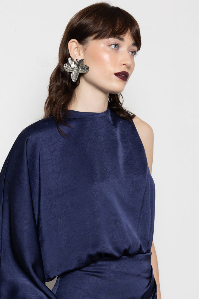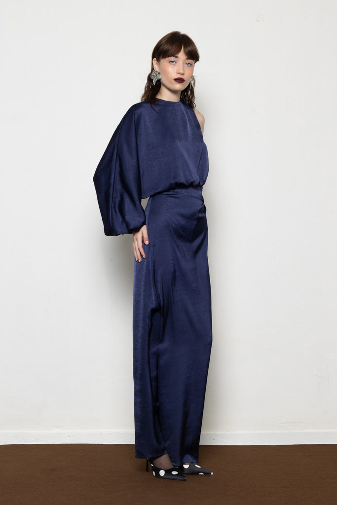 Asymmetric blue with a single voluminous sleeve and high neckline —sculptural, dramatic, and unapologetically bold. A statement silhouette for after-dark elegance.