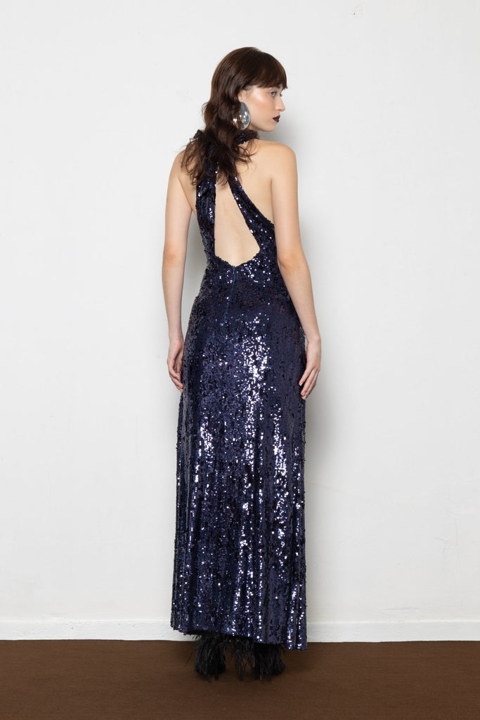 Sleeveless full-length dress in midnight blue sequins with a high neckline and subtle racerback cut — bold, radiant, and made to command the room.
