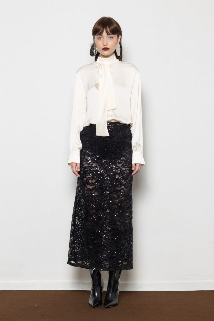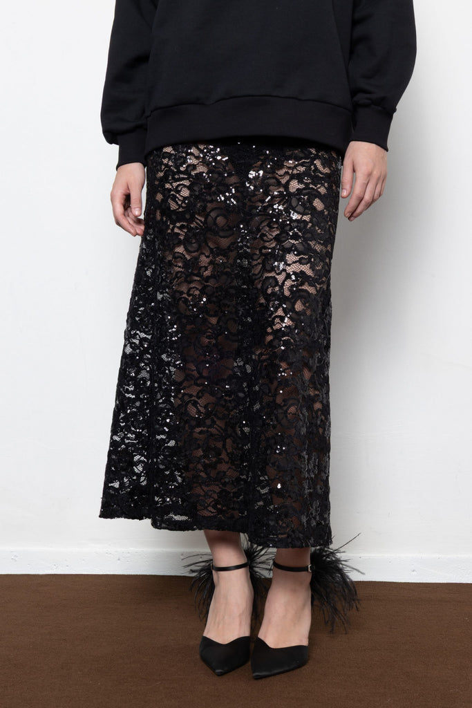 Sequined black lace midi skirt with a sheer finish —elegant, sultry, and perfect for statement styling. **LINING NOT INCLUDED