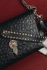 Handcrafted leather shoulder bag with carved nickel metal details. Comes with double strap, one leather strap and one chain strap. Contains removable leather wallet.
