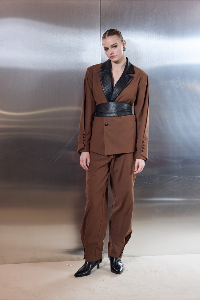 Elevate your look with the Oxford Blazer-a statement piece that combines structure, texture and elegance. Crafted from a rich brown fabricwith a subtle matte finish, it features a contrasting faux-leather lapel and a wide wrap belt taht cinches the waist for a defined silhouette. Its relaxed yet tailored fit makes it perfect for both professioanl and evening wear.