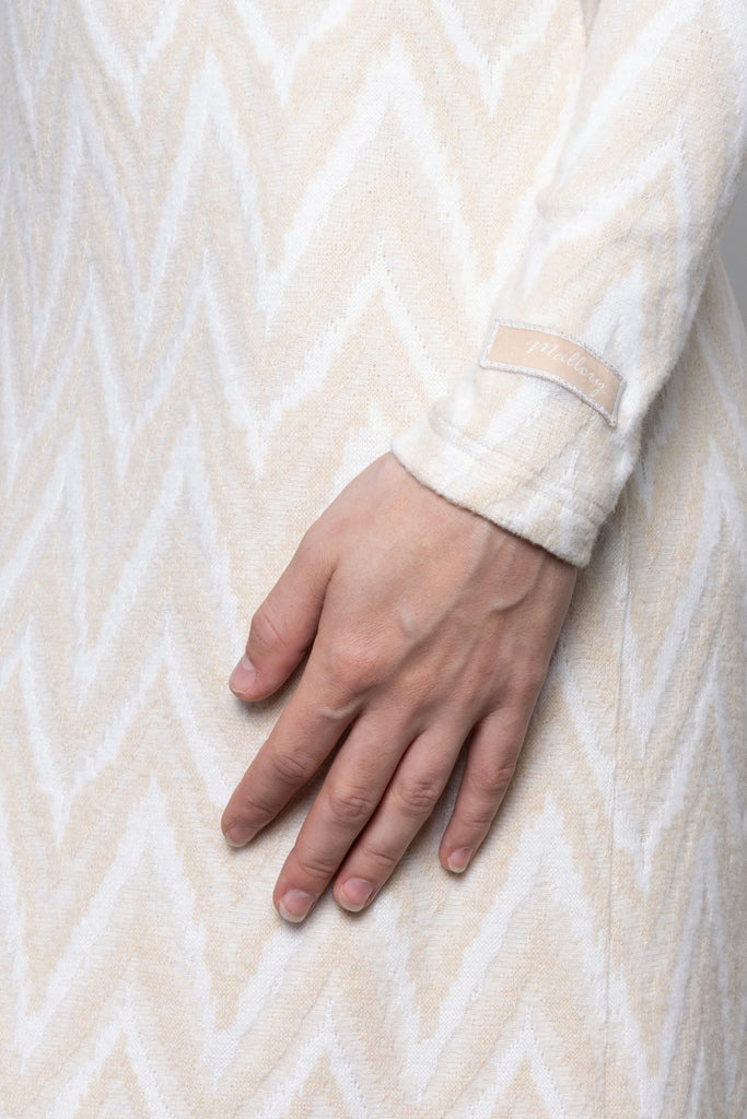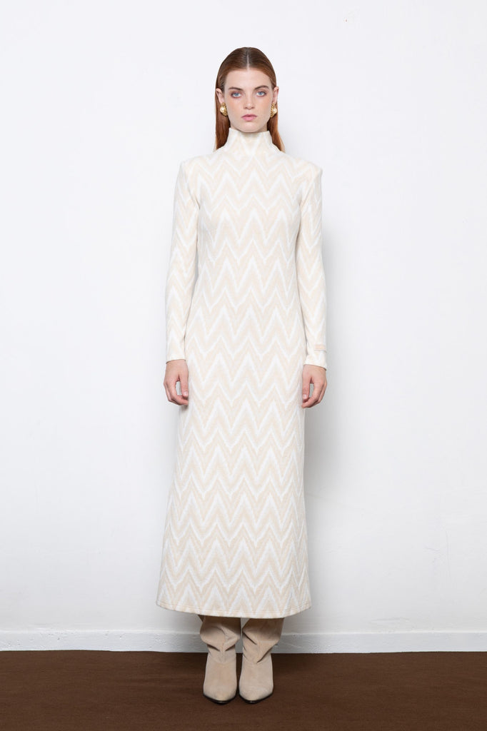 Long-sleeve knit maxi dress with high neck and zigzag pattern —graceful, modern, and quietly striking.